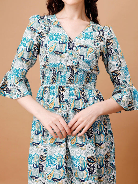 Experience the beauty of our Bluish Flowers Match with Peach V-Neck Midi Dress, featuring a stunning floral print and elegant V-neck design.