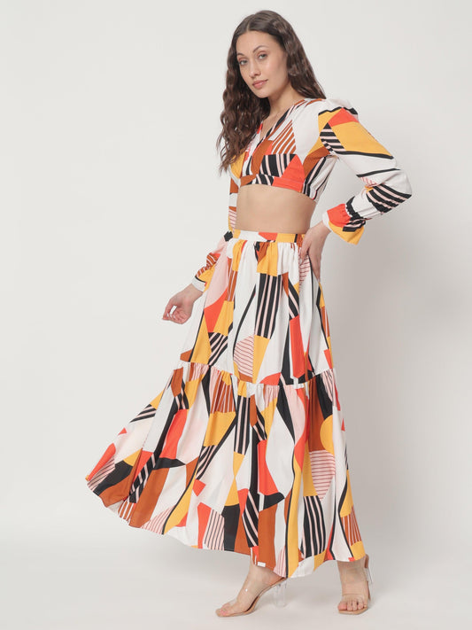 - Fitted top and flared skirt