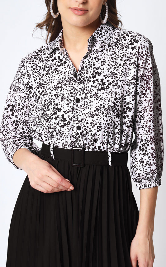 A-line Dress with Pleats, Printed Round Neck Top, and Flared Sleeves