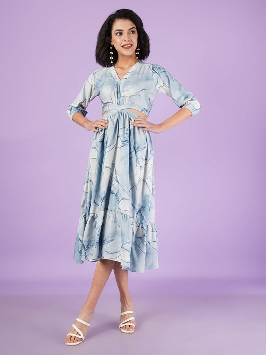 Round Hexa Shape Bluish V-Neck Long Dress With Back Cut-Out